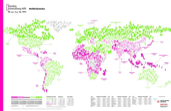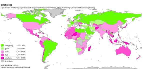 Bauletter, BAULINKS.de-Meldungen, vom 15.6.2011Naturgewalten bedrohen vielerorts die Bevölkerung enorm, obwohl das Ausmaß ihrer Gefahr gering ist. Das zeigt der Weltrisikobericht des Bündnisses "Entwicklung Hilft", der Länder nach ihrer Anfälligkeit und Verletzbarkeit für Naturgefahren aufschlüsselt. "Wir untersuchten, welche Ereignisse bisher Todesopfer gefordert haben oder sich zu Katastrophen entwickelten. Für die Vulnerabilität wurden dazu erstmals auch Regierungsformen und Versicherungsschutz berücksichtigt", erklärt Jörn Birkmann, wissenschaftlicher Leiter des Projekts von der Bonner United Nations University (UNU). Abhängigkeiten entscheiden über Risiko Die Länder mit dem höchsten Risiko sind Pazifikinseln wie Vanuatu, Tonga und die Salomonen, daneben die Philippinen, Bangladesch und mittelamerikanische Staaten wie Guatemala, Costa Rica und El Salvador. Ihr Gefährdungsindex von 15 bis 32 Prozent geht nicht nur auf häufige Erdbeben, Wirbelstürme, Hochwasser oder steigendes Meer zurück. Anfällig machen auch Abhängigkeiten wie jene der Infrastruktur, Ernährung oder Wirtschaft, fehlende Möglichkeiten zur Bewältigung durch Politik, Medizin und Sozialsystem und schlechte Anpassungsfähigkeiten auf künftige Ereignisse und den Klimawandel. Mitteleuropa zeigt sich als erwartungsgemäß sicher: Deutschland nimmt im Risiko-Ranking Rang 150, Österreich 144 und die Schweiz Rang 160 von 173 untersuchten Ländern ein, wobei hier die Gefährdung mit 2,5 bis 3,5 beziffert wird. "Die größte Naturgefahr ist bei uns das Hochwasser. Die Anfälligkeit ist jedoch dank guter Versorgung und Regierungsführung sehr niedrig", so Birkmann. Die ungefährlichsten Länder in der Liste sind Katar, Malta, Saudi-Arabien, Island. Sobald in einzelnen Ländern Korruption ins Spiel kommt, steigt das Risiko jedoch, wie an den Beispielen Albanien oder Italien sichtbar wird.
