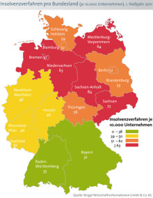Da das konjunkturelle Hoch laut führenden Wirtschaftsinstituten anhalten soll - wenn auch in abgeschwächter Form - rechnet man bei Bürgel für das Gesamtjahr 2011 mit einer auf bis zu 30.000 Fälle sinkenden Zahl an Firmeninsolvenzen. Das entspricht dem zahlenmäßigen Niveau vor der Finanzkrise. "Würde sich der wirtschaftliche Aufwärtstrend im aktuellen Jahr weiter fortsetzen, gäbe es bezogen auf die vergangene Dekade nur im Jahr 2007 weniger Firmeninsolvenzen als im Jahr 2011", ergänzt Sellin. Allerdings mussten im zweiten Quartal 2011 ca. 6,1 Prozent mehr Firmen einen Insolvenzantrag stellen als im ersten Quartal des Jahres: Waren es in den ersten drei Monaten lediglich 7.423 Unternehmen, standen im Folgequartal 7.879 Firmen vor dem Aus. Die weitere Entwicklung der Unternehmensinsolvenzen könnte indes stark von der Schuldenkrise in Europa, die den hiesigen wirtschaftlichen Aufschwung zu dämpfen droht, beeinflusst werden. Bei den absoluten Zahlen im Ländervergleich verteilen sich die 15.302 Firmeninsolvenzen im ersten Halbjahr am stärksten auf Nordrhein-Westfalen (3.187), Bayern (1.870) und Niedersachsen (1.701). Bei der aussagekräftigeren relativen Betrachtung je 10.000 Firmen müssen in Bayern (32 je 10.000 Unternehmen) und Baden-Württemberg (35) am wenigsten Firmen aufgeben. Während der Bundesdurchschnitt bei 48 Insolvenzen je 10.000 Unternehmen liegt, gestaltet sich die Situation in Bremen mit 91 Fällen je 10.000 Firmen am gravierendsten. Auch in Sachsen-Anhalt (84) und Sachsen (73) ist die Lage angespannt. Bremen fällt aus der ReiheMit einer Ausnahme ist die Zahl der Firmeninsolvenzen im ersten Halbjahr in allen Bundesländern rückläufig: Lediglich Bremen verzeichnet einen Zuwachs von 5,7 Prozent auf 223 Fälle. Den stärksten Rückgang um minus 18,5 Prozent erlebt hingegen Baden-Württemberg. Aber vor allem auch in Bayern und Sachsen-Anhalt (je minus 17,2 Prozent) sowie Berlin (minus 17,1) sinken die Werte zweistellig. Den Löwenanteil der Firmeninsolvenzen im Untersuchungszeitraum halten Gewerbetriebe und Einzelunternehmen mit 44,5 Prozent, gefolgt von den GmbHs mit einem Anteil von 35,8 Prozent unter den Pleitiers. Bei allen analysierten Rechtsformen sinken die Insolvenzzahlen im Vergleich zum 1. Halbjahr 2010 - bei der GmbH & Co. KG sogar um minus 23 Prozent, bei den Gewerbebetrieben und Einzelunternehmen immerhin um minus 2,4 Prozent. Junge Firmen am anfälligstenEin Viertel der Unternehmen (25,7 Prozent), die im ersten Halbjahr 2011 Insolvenz anmelden mussten, war nur bis zu zwei Jahre am Markt aktiv. Diese jüngste Altersgruppe, die statistisch oft unter Eigenkapitalmangel leidet, verzeichnet jedoch gegenüber dem 1. Halbjahr 2010 eine minimale Verbesserung um minus 1,5 Prozent. "Viele der insolventen Unternehmen wurden vor zwei Jahren zu Hochzeiten der Finanzkrise gegründet. Die Folgen des schwierigen Startzeitpunkts werden jetzt erkennbar", kommentiert Bürgel Geschäftsführer Sellin. Indes beträgt der Anteil jener Unternehmen an der Insolvenzstatistik, die länger als 50 Jahre am Markt aktiv sind, lediglich 2,5 Prozent. Zudem gehen die Unternehmensinsolvenzen in dieser Gruppe um 19,7 Prozent zurück. Ähnlich gute Rückgänge um 19,8 Prozent verzeichnet die Gruppe der mehr als 20 Jahre am Markt Aktiven. Die Ursachen für Unternehmenspleiten sind vielfältig: