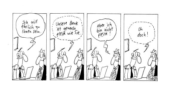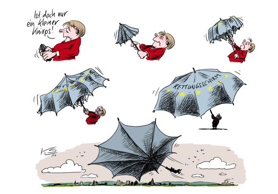 Klaus Stuttmann zeichnet vor allem für die Zeitung „Der Tagesspiegel“ (Berlin). Gegenstand seiner ausgezeichneten Karikatur ist der Euro-Rettungsschirm, der sich in den Händen Angela Merkels vom Knirps zum Monsterschirm aufbläst und die Bundeskanzlerin mit sich fortreißt (Bild oben). Platz zwei und 2.000 Euro gehen an Elias Hauck und Dominik Bauer un und die „Frankfurter Allgemeine Sonntagszeitung“ zum Thema Bankenpleite (Bild unten). Der dritte Preis (1.000 Euro) wird in diesem Jahr ausnahmsweise zweimal vergeben. Ihn erhalten Berndt A. tt („Kölner Stadt-Anzeiger“) und Jürgen Tomicek („Westfälische Nachrichten“, Münster), die in ihren Arbeiten die ungeklärte Rolle von V-Leuten in der Neonazi-Szene (Bild) und die Ehec-Hysterie als Gemüse-Krimi (Bild) aufgespießt haben. „Die ausgezeichneten Arbeiten sind in ihrer politischen Verdichtung und künstlerischen Umsetzung Glanzstücke“, erläutert dazu BDZV-Hauptgeschäftsführer Dietmar Wolff: Themen wie der Euro-Rettungsschirm oder die Bankenpleite seien zum Beispiel im Foto kaum darstellbar und müssten in Leitartikel und Kommentar ausführlich erläutert werden. „Die Karikatur aber bringt es auf den Punkt.“ Das mache sie zum unverzichtbaren Stilmittel für die Meinungsseiten der Zeitungen. „Und es spricht für die Qualität der preisgekrönten Karikaturen, dass die meisten auch ein halbes Jahr nach ihrer ersten Veröffentlichung noch genauso abgedruckt werden könnten.“
