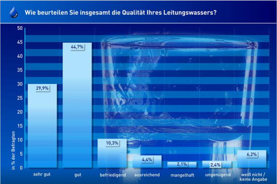 Die Verbrauchermeinung wird auch durch den jüngsten Bericht zur Trinkwasserqualität des Bundesministeriums für Gesundheit (BMG) und des Umweltbundesamtes (UBA) gestützt. Er bestätigt, dass die qualitativen Eigenschaften des Trinkwassers ausschließlich Bestnoten bekommen. Ein weiteres Ergebnis der TWIS-Studie: Je weniger die Verbraucher den tatsächlichen Wasserpreis kennen, desto kritischer ist ihre Haltung.