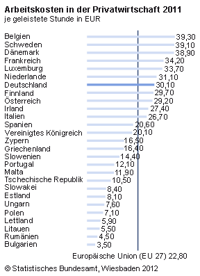 Im Verarbeitenden Gewerbe, das besonders im internationalen Wettbewerb steht, kostete eine Arbeitsstunde in Deutschland 2011 durchschnittlich 34,30 Euro. Hier lag Deutschland im EU-weiten Vergleich auf Rang fünf. Eine Stunde Arbeit in der deutschen Industrie war 48% teurer als im EU-Durchschnitt, aber 4% billiger als in Frankreich. Über einen längeren Zeitraum betrachtet nimmt Deutschland bei der Entwicklung der Arbeitskosten in der Privatwirtschaft eine Sonderstellung ein: Zwischen 2001 und 2011 hatte Deutschland mit +19,4% den mit Abstand geringsten Anstieg der Arbeitskosten aller Mitgliedstaaten der EU. Zum Vergleich: In Frankreich sind die Arbeitskosten in diesem Zeitraum mit +39,2% mehr als doppelt so stark gestiegen.