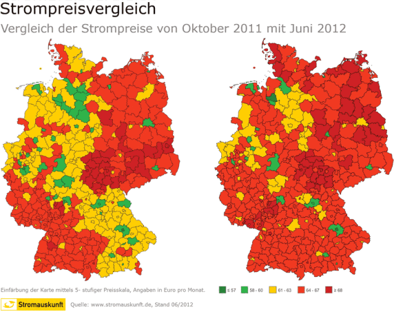 Bauletter, BAULINKS.de-Meldungen, vom 25.6.2012Atlas für Strompreise visualisiert die StromkostenNur in wenigen Lebensbereichen sind die Preise so gestiegen wie beim Strom. Allein im Zeitraum vom Jahr 2000 bis 2010 haben sich die Strompreise für einen 3-Personen-Haushalt um rund 60 Prozent erhöht. Den rasanten Anstieg der Strompreise zeigt jetzt aufschlussreich ein visueller Strompreisvergleich, der auf Basis des Strompreis-Atlas vom Verbraucherportal StromAuskunft.de entwickelt wurde: Die Abbildung "Strompreisvergleich Deutschland" zeigt die Veränderung der Strompreise in Deutschland für den Zeitraum Oktober 2011 bis Juni 2012 an. Die Strompreise sind farblich unterschiedlich dargestellt, so dass die Karte auf einen Blick zeigt, wo Strom für Verbraucher in Deutschland günstig oder teuer ist und wie sich die Preise verändert haben. Man erkennt auf einen Blick, dass sich die Karte von Juni 2012 deutlich mehr in den roten Bereich verschoben hat, Strom also teuerer geworden ist.