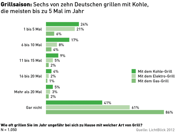 Bauletter, BAULINKS.de-Meldungen, vom 18.7.2012Klimakiller Grillsaison60 Prozent der Deutschen schmeißen ihn mindestens einmal im Jahr an: den Holzkohlegrill. Der rauchige Geschmack und die gemütliche Atmosphäre der knisternden Glut machen den Klassiker der Grillvarianten zum Spitzenreiter auf der Beliebtheitsskala. Ein Gasgrill kommt dagegen nur bei 14 Prozent zum Einsatz. Immerhin 40 Prozent - Wintermonate eingeschlossen - nutzen einen Elektrogrill. Zu diesen Ergebnissen kommt eine repräsentative Umfrage unter 1.000 Bundesbürgern, die im Juli im Auftrag des Öko-Energieanbieters LichtBlick durchgeführt wurde.