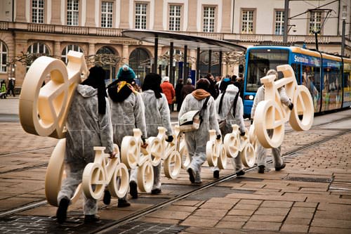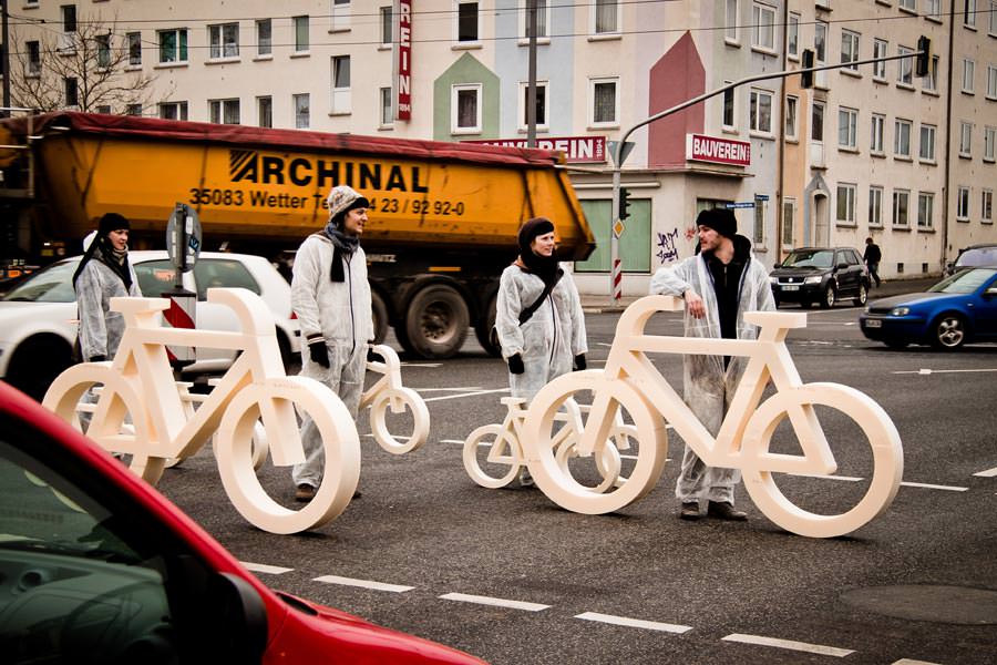 Dazu nutzten sie moderne Technik und - unterstützt von URSA - extrudierte Polystyrol-Hartschaumplatten, die normalerweise als Dämmstoff für außenliegende Anwendungen im Hochbau zum Einsatz kommen. Die Architekturstudenten sollten im Fachgebiet von Prof. Claus Anderhalten den Umgang mit dem „Rapid Prototyping“ lernen. Dabei schneiden moderne 3D-Plotter mittels Heißdraht ein architektonisches Modell aus feuchteunempfindlichen und hochdruckfesten XPS Dämmplatten. Projektleiter Mark Niehüser jedoch versah das Vorhaben obendrein mit gesellschaftlicher Relevanz und entwickelte eine völlig neue Protestform - das „Rapid Protesttyping“. Die Kursteilnehmer sollten sich ein Thema suchen, das sie privat oder gesellschaftlich stört, und mittels Heißdraht-Schneidemaschine ins Bild setzen. Zu denjenigen, die auf die Fahrradidee kamen, gehören Jo Götze und Merten Ebert. Die dreidimensionalen Fahrräder in Lebensgröße springen ins Auge. Bei Nacht und im Regen stehen sie am Fahrbahnrand der Schnellstraße. Wie eine Entenfamilie überqueren sie, erst groß, dann klein, die Kreuzung. Und liegend auf dem Asphalt scheinen sie zu sagen: Unfall, übel. (Die Bilder sind von Chris Volkmer.)